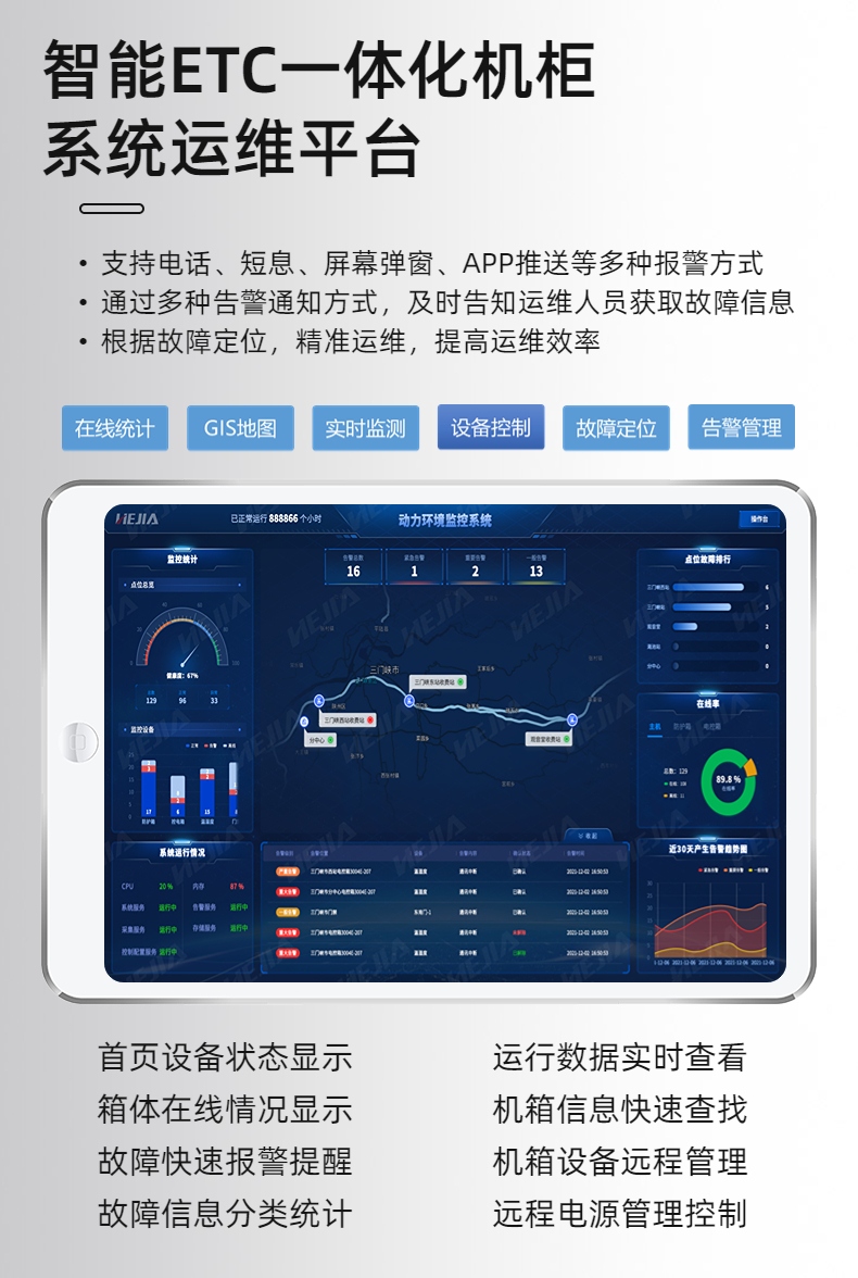 ETC一体化机柜是集远程控制、智能集中供电、防雷、动环监控、报警处理等功能为一体的监控主机。它主要用于ETC门架系统,为网络、安全、边缘计算及存储等设备提供一体化收容、可靠供备电及温控,以保障ETC门架系统相关设备的可靠运行。同时,通过统一网管对站点设备进行远程运维管理。