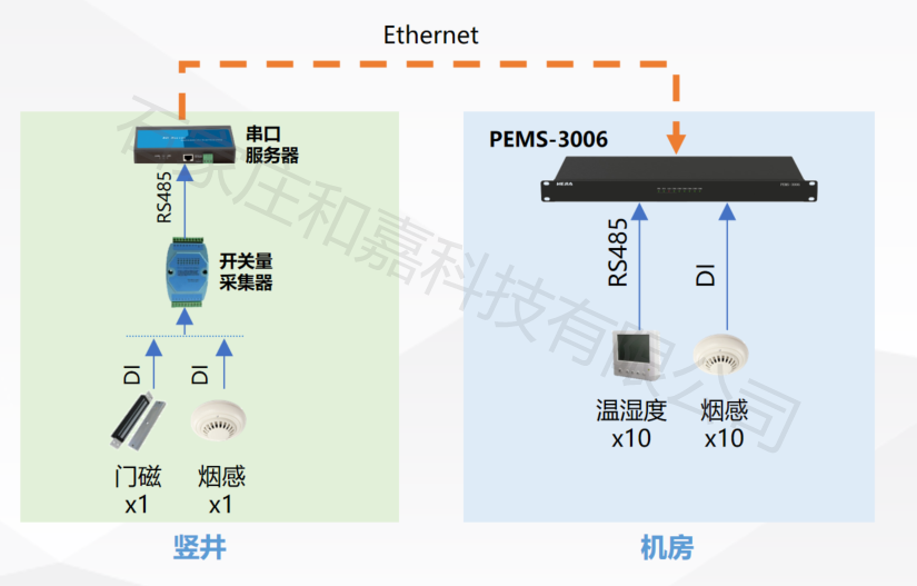 竖井侧信号转换烟感、门磁等传感器→MD82采集器→SS60-2串口服务器→局域网。