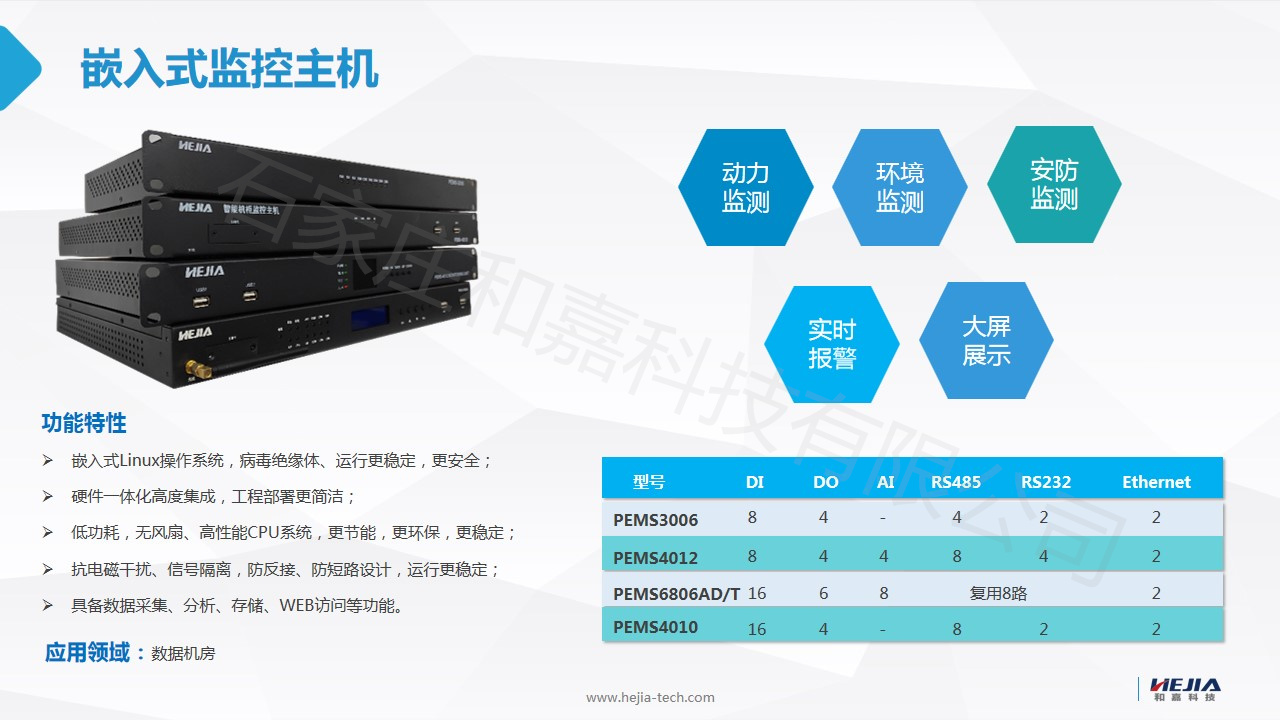 硬件:自主研发PEMS系列嵌入式监控主机,覆盖从微型弱电间到大型数据中心的全部场景;