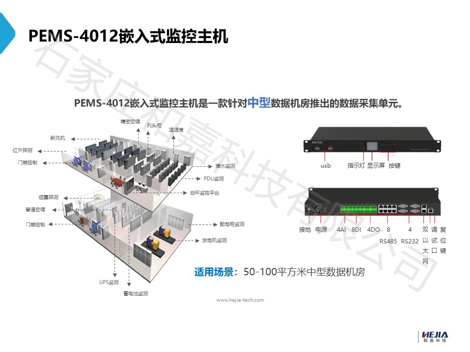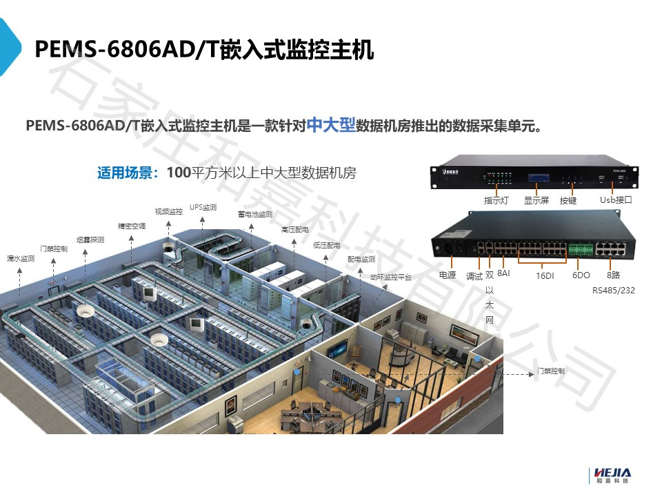 面向100平方米以上的中大型数据中心设计。支持高压配电、低压配电、UPS、蓄电池、视频监控等多种设备接入,具备强大的数据处理能力和多种通信接口,是大型机房可靠的数据采集核心。