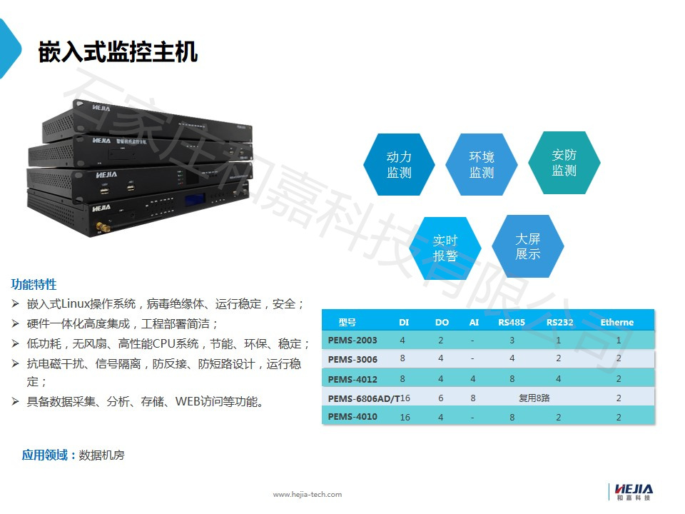 和嘉科技提供嵌入式监控主机系列(如PEMS-3006、4012、6806等),适配不同规模机房,具备高集成、低功耗、抗干扰等特性。配套智能传感设备如温湿度传感器、漏水控制器、门禁系统、蓄电池监测模块等,构建完整的感知层。