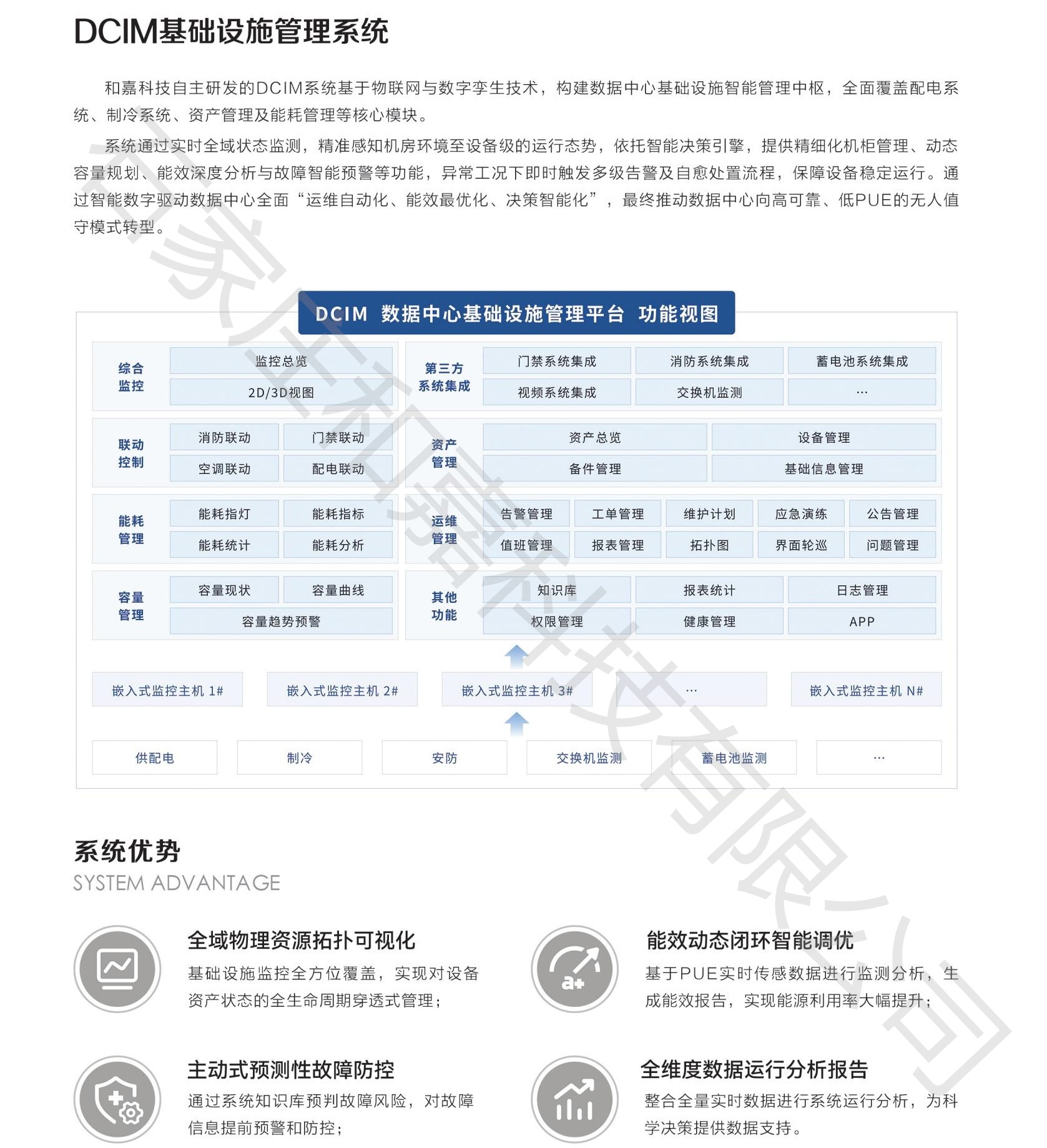 软件部分:通过统一的DCIM数据中心管理平台,将原本孤立的子系统数据打通,实现动力、环境、安防、资产的集中监控与智能联动。