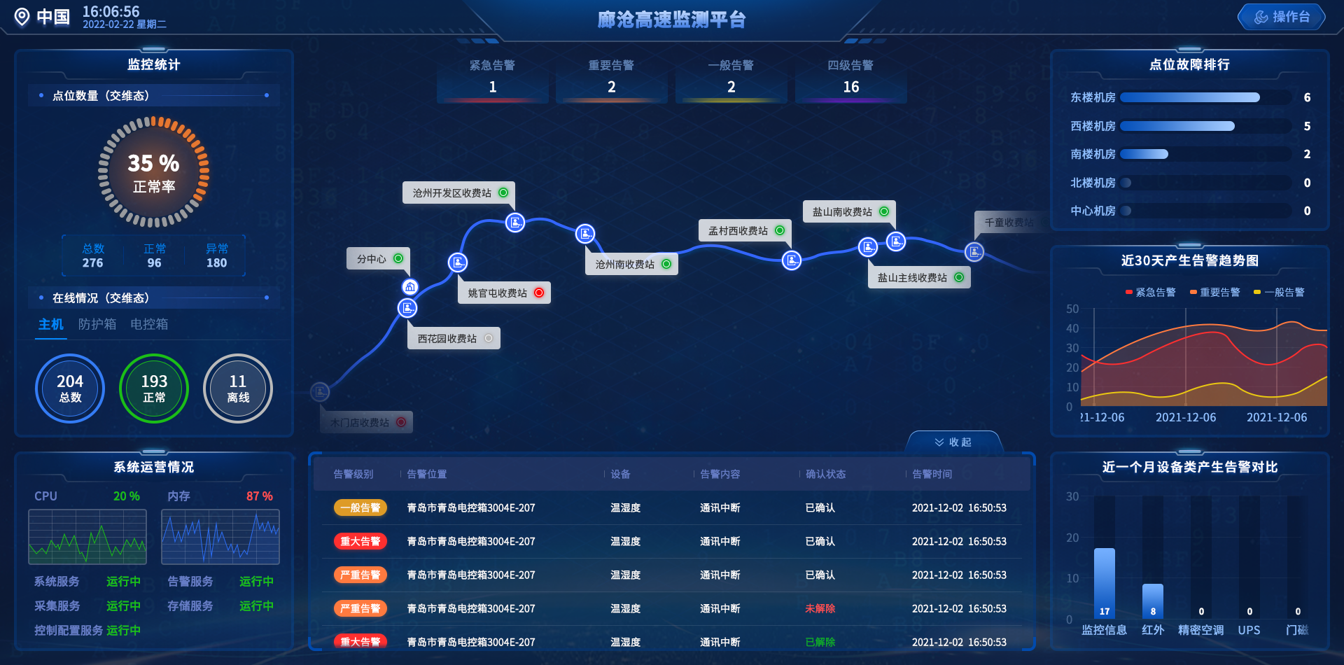 平台有GIS地图功能,可实现设备定位,实时监控,故障定位,告警管理等功能,在平台即可实时查看设备运行状态,接收并分析设备故障报警信息,自动生成报表,帮助高速公路ETC门架系统运行状态数据化呈现。