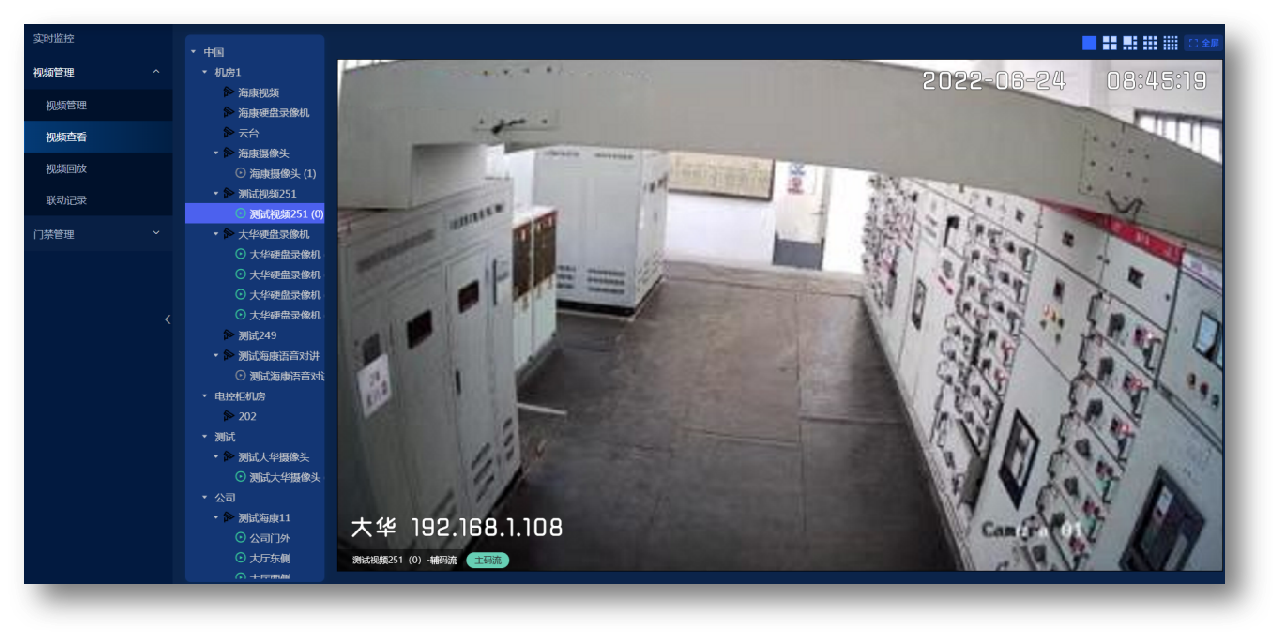 机房动环监控主机通过第三方协议实时获取机房内的监控画面,在机房内部重要部位安装摄像头,如:机房门口、机柜上方、漏水监测点等。同时,机房动环监控主机系统提供对接入视频单屏、四屏、六屏、九屏和十六屏的实时查看和回放,实现全方位的机房监控。