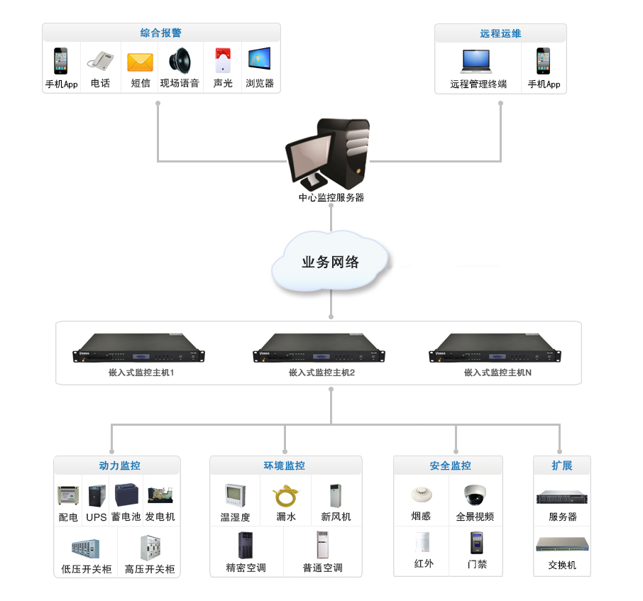 监测的内容包含有动力监测、环境监测、安防监测等内容,并配备智能运维平台,将监测数据实时通过平台展示、弹窗告警,让信息可视化,简化巡检和分析流程。