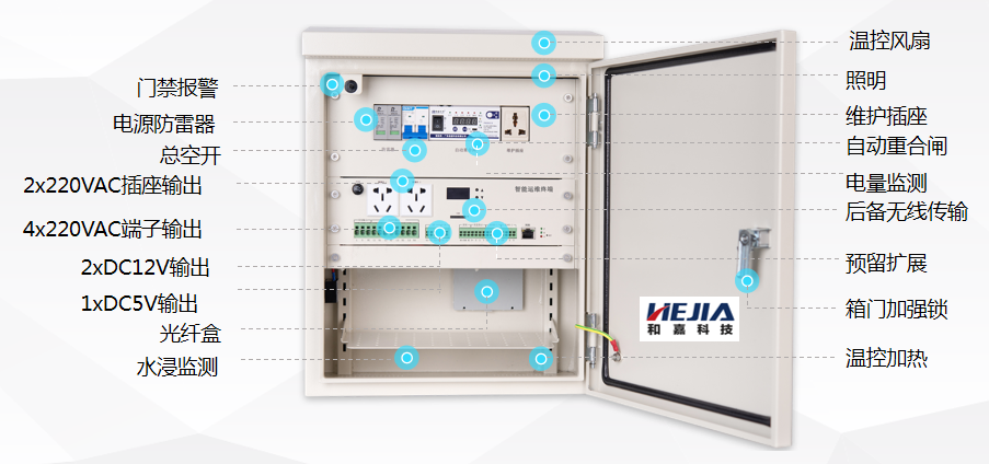 智能运维箱在原有配电箱的基础上,增加了应用物联网通讯技术、信息化管理技术、智能监控技术,集供配电监控与管理、网络接入与监控、机箱环境监控、远程控制等功能于一体,其内部结构如下图所示