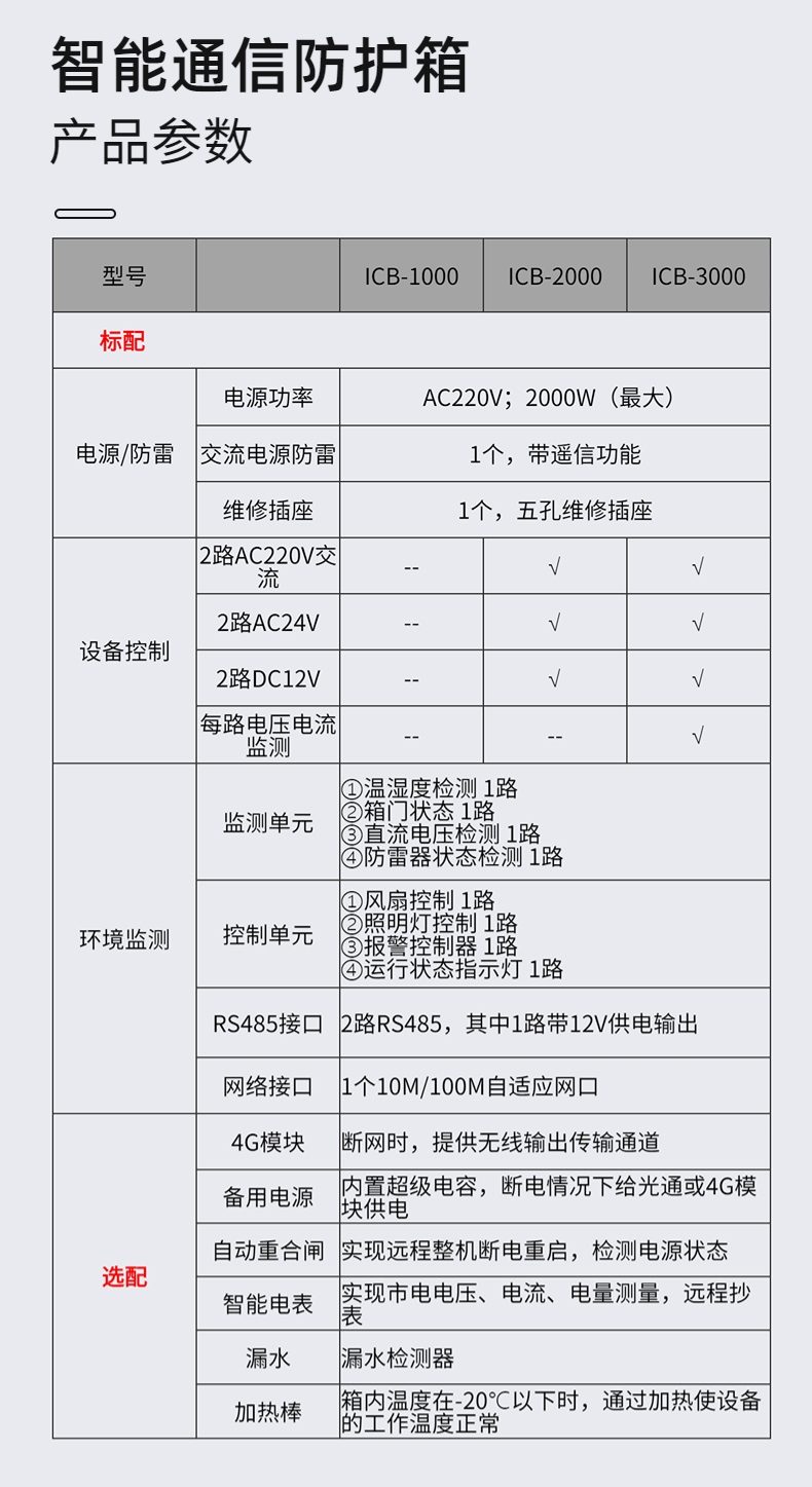 ICB-1000满足用户基本功能需求,提供多路AC220V、DC12V、DC5V供电,可对每路供电进行上电、下电操作;可实时监测箱内温湿度、开关门状态、电流、电压、功耗、防雷器等参数。